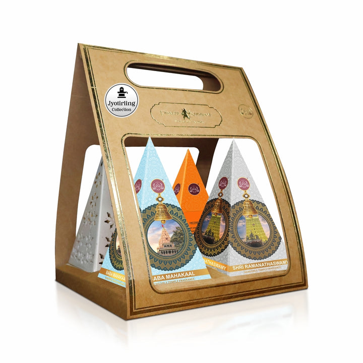 This luxury incense set includes three temple-inspired fragrances and an elegant ceramic pyramid diffuser. Each cone is like a prayer carried in fragrance, while the diffuser holds and spreads this divine energy through your space. Perfect for worship rituals, housewarmings, and meaningful cultural occasions, the Jyotirling Collection honours India’s ancient spiritual heritage while adding grace and cultural depth to any home.